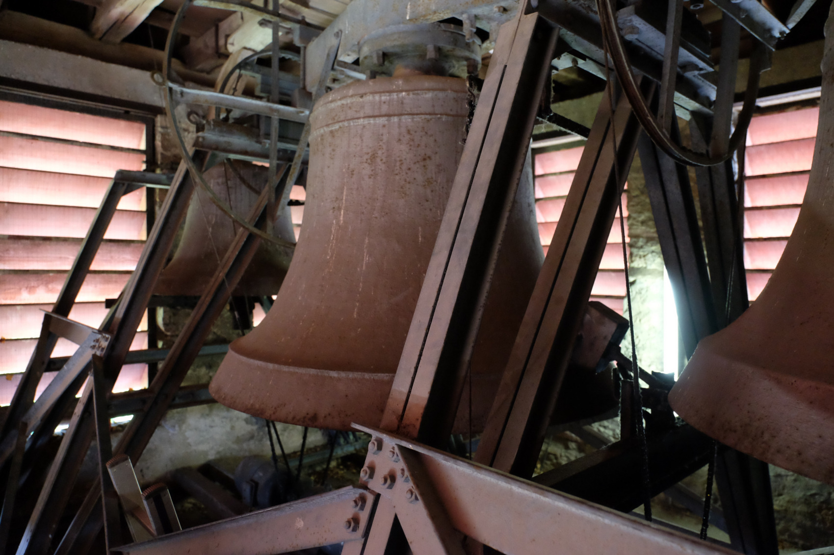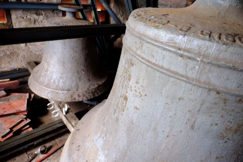 Die Glocken sind derzeit alle abgehängt und ruhen auf dem Boden des Glockenstuhls.