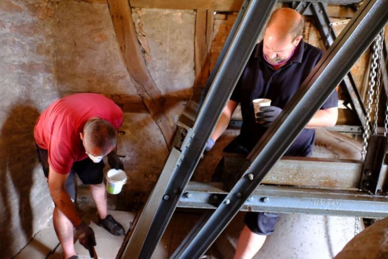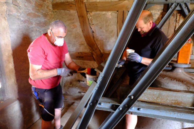Mitarbeiter der Fa. Bachert versehen die Elemente des stählernen Glockenstuhls mit einer Rostschutzfarbe.