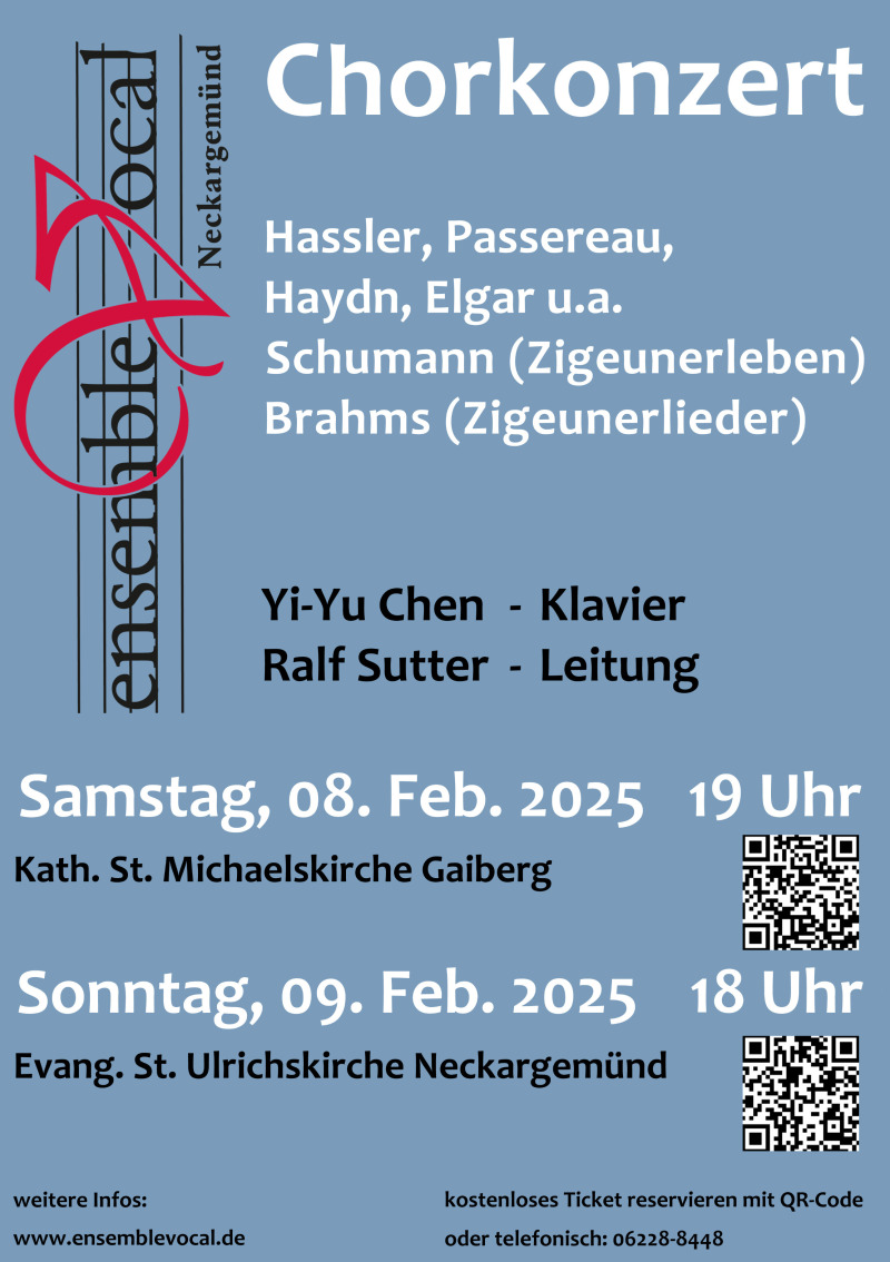 Das Konzert findet am Samstag, 8. Februar 2025 um 19 Uhr auf Einladung des Ev. Kirchenbauvereins Gaiberg e.V. in der Kath. Michaelskirche Gaiberg statt. Der Eintritt ist frei.